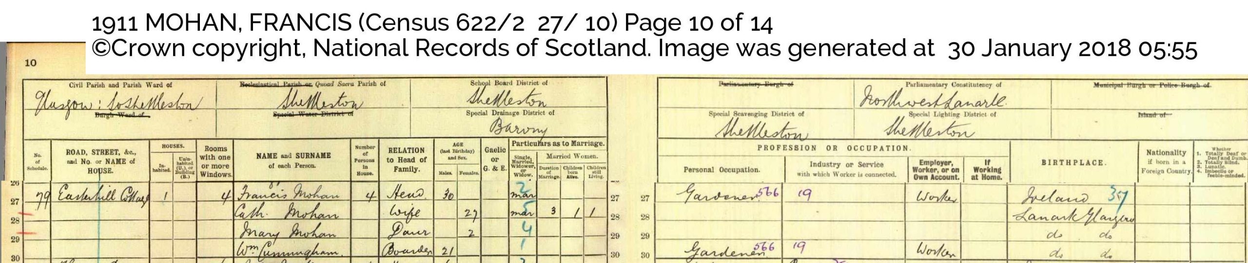 Francis married Catherine Cunningham from Coatbridge, a Scots-Irish Catholic coal mining family, on December 27, 1907, in Shettleston, an area of Glasgow known for its vibrant Catholic Irish migrant community and IRA affiliations. Catherine’s coal mining brother was a frequent visitor to their secluded gardener’s cottage near Tollcross Park. During this time, Francis often took the ferry to Ireland and even visited New York to see Irish relatives.