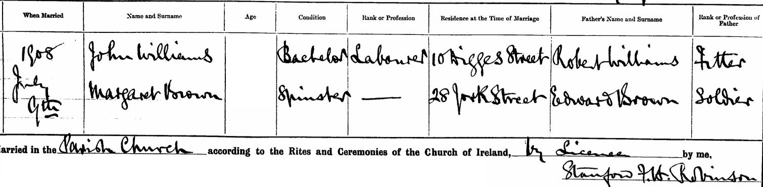 DUBLIN (COI) , Parish/Church/Congregation – MOLYNEUX CHAPEL Baptism of JOHN WILLIAMS of 6 BRIDE ST on 1 June 1884 Father ROBERT WILLIAMS Engine Fitter Mother FANNY WHITAKER Group Registration ID 10438664