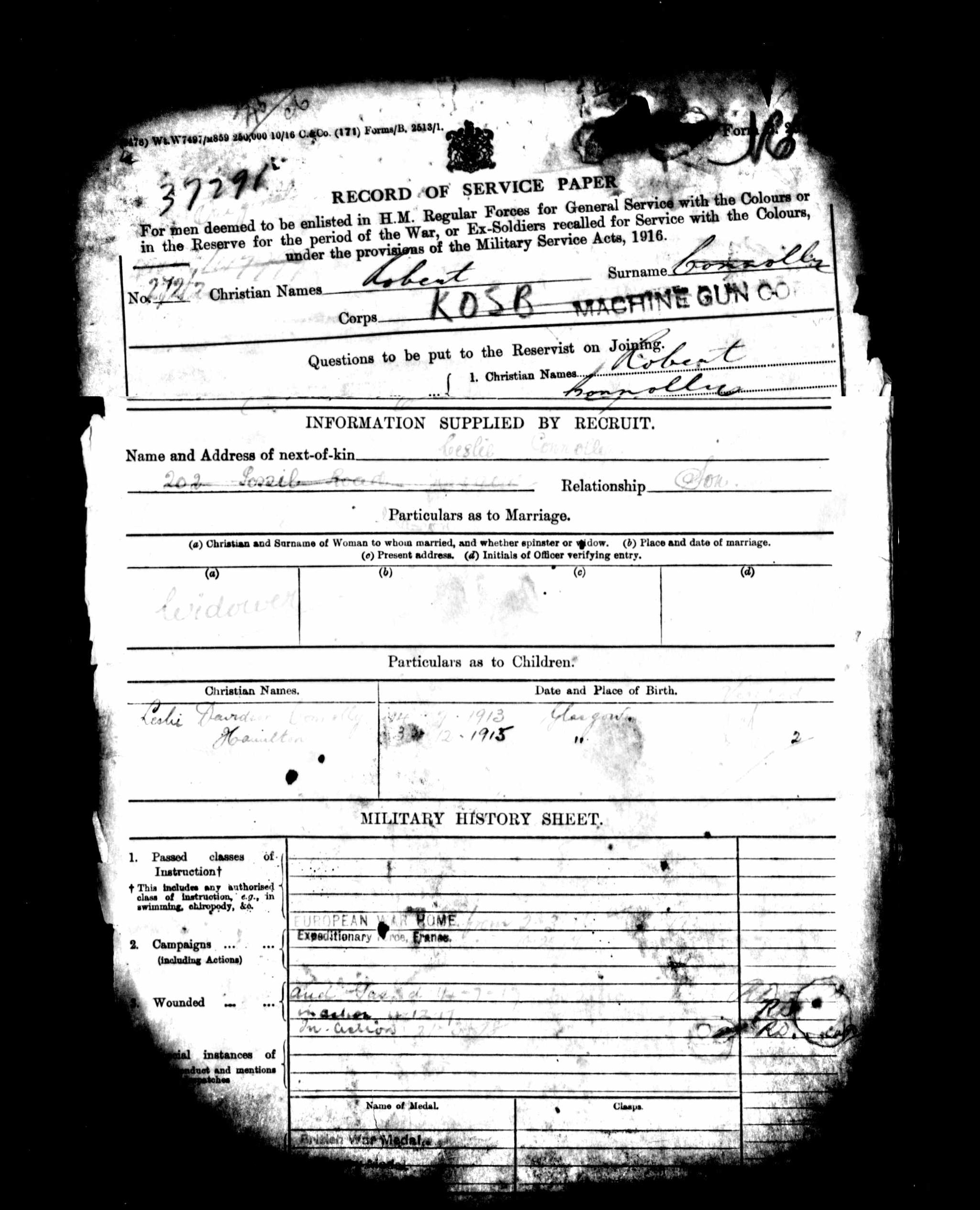 After the war, his War Office records indicate he was a widower who settled down with his second wife, Christina Gow, with whom he had two sons. While Christina was with him until the end (1941), and Robert’s name appeared on her death certificate many years later(1972), his death record still listed Susan Kelly (1909) as his wife.